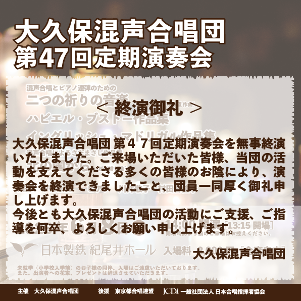 06/08/2025 第47回定期演奏会 終演御礼 本日開催いたしました、大久保混声合唱団第47回定期演奏会は、ジメジメと蒸し暑いの中ではございましたが、日本製鉄紀尾井ホールに多くのお客様にご来場いただき、無事に終演いたしました。 ご来場いただきました皆様に、団員一同厚く御礼申し上げます。 また、活動に際し、支えてくださいました多くの皆様にも重ねて御礼申し上げます。 今後とも大久保混声合唱団の活動に、ご支援・ご指導のほど、何卒、よろしくお願い申し上げます。 tagPlaceholderカテゴリ: